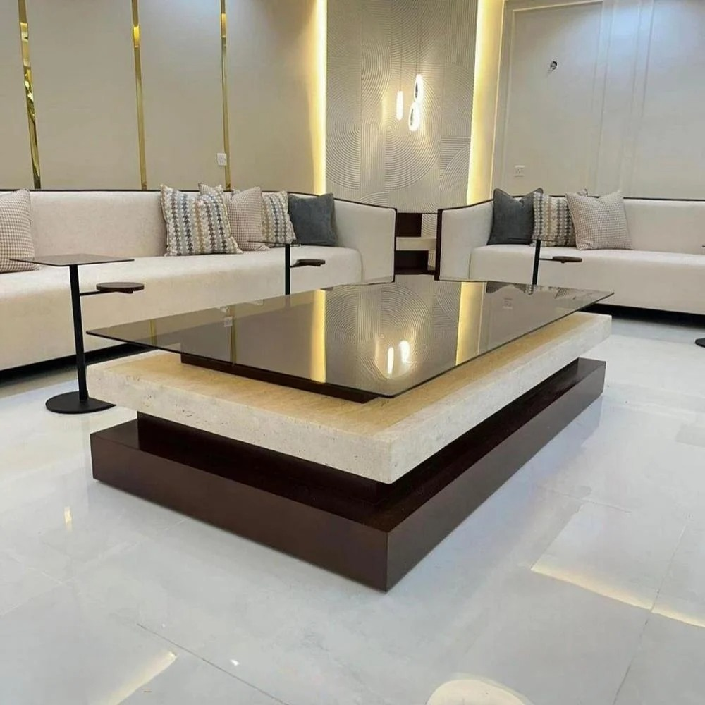 طاولة كنب عصرية بتصميم فاخر وسطح زجاجي، مثالية لغرف المعيشة والمجالس، تضفي لمسة جمالية على أي تصميم داخلي.
